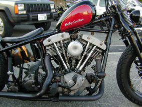 旧車チョッパーイメージでサンドブラストでマット処理されたエンジンやキックカバー。 同じくマット処理のS&Sキャブ,マッシュルームカバーがエンジンの中央で自己主張しています。 フレームのタンクマウントをあえて,カットしていないので横から見るとマウント部分がタンクの中にめり込んでいるようですね。ハーレーのタンクロゴはピンストライプでセンス良く描かれています。 半ツヤブラックのドラッグマフラーはパンヘッドのカスタムマフラーをイメージしてワンオフ製作。フロントマフラーのとりまわしとフロントとリアのマフラーが一直線に並んでみえるところがポイントです。 |