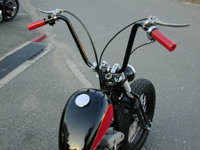 ブラック74スプリンガーに取り付けられた,わざとメッキを残してあるライザーにセットされたエイプバー。 このエイプバーも製作者のイメージで幅つめされ,グリップが外側に開くような角度に加工してあります。 また,ブラック塗装されたエイプバーにその加工跡が分かるように後処理をしてありません。 しかし,その処理は決して荒さを感じさせるものではなく,このバイクの雰囲気にマッチしたディティールになっているところが感心させます。 よく見るとクラッチレバーのところに後付けのユニバーサルスイッチが配線と共に。このような部分,旧車ファンなら理解できるでしょう。 |