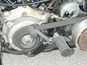 プライマリーカバーが取り外された,荒々しいイメージのオープンプライマリー。 ミッドステップはクランクケースやミッションサポートのボルトを利用してワンオフ製作されたものです。変にデザインに凝らず,むしろ取りまわし方法を重視してレーシーなイメージで製作されています。 一見,簡単そうなステップですが,シフトの取り回しがパズルのようで見た目以上に手間のかかっている場所です。 |