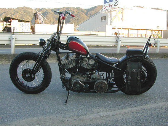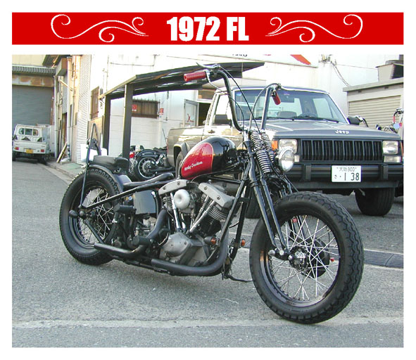 ショベルチョッパーでありながら,旧車テイストを感じさせるこのバイクは,1972年式FLをベースにハードテイルキットを組み込んだ1台です。 ショベルヘッドベースではありますがナックルヘッドやパンヘッドで使用するようなカドミウムパーカーのネジや,表面仕上げ・配線表現にこだわりました。 やれた旧車を感じさせるように,このバイクではメッキ部分を極力減らしエンジン表面もサンドブラストでマット処理してあります。 旧車をイメージさせる半つや消しブラックのフレームに合わせて,ホイールリムやハンドルバー,シシーバーまで同色ペイント。 18インチタイヤは,初期ナックルや旧車レースではよく見られる仕様でした。 シックスモーターサイクルではめずらしくVLテールライトなども使用されています。 操作系はオーナーの希望で大阪市内での乗りやすさを優先してハンドクラッチとミッドステップになりました。 フレームのラインがギリギリ隠れる位置にマウントされたピーナッツタンクは旧車イメージの強い,細いゴールドラインが入ったワインレッドとブラックのベタ塗装。 また,写真では分かりませんがフレーム等に這わしている配線などもビニールなどは使用せずに,布巻きのコタツ配線やチューブをプラスチックのタイラップなどでは,止めず布テープで上手に処理する,「見せる配線」としてあります。 このような,配線処理は製作者の档eクニックだそうであまりアップで公開しないでといわれました。 ぜひ,実物を見て,そのテクニックを御覧ください。 |