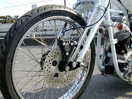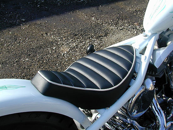 | ホワイトとクロムに分けられた74スプリンガーにグリメカのディスクブレーキシステム。当店ではスプリンガーにはドラムか何も無しかのどちらかなのですが制動距離短縮のために今回初めてこのシステムを取り入れました。これで誰でも安心して走れるというものです。フロントウインカーは某雑誌を見てなにか我々の知らない法則でもあるのか、この位置にあるようなのでそれを真似てみました。間にはホーンもあります。 | 余白 | リジッドフレームの衝撃緩和性能はお世辞にも優れているとは申せませんので一家の主であるオーナーの老後のことを考慮に入れせめて肉厚のあるソロシートを用意させていただきました。すべり止めもかねて段差の深いステッチに気品溢れるホワイトのパイピングが映える逸品です。小さなシートではありますが、いざ腰を据えるときの優越感や満足度たるや中小企業の社長椅子などの比ではないことを最後に申し添えておきましょう。 |