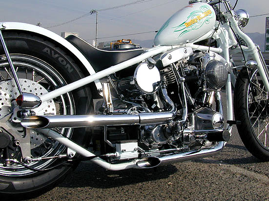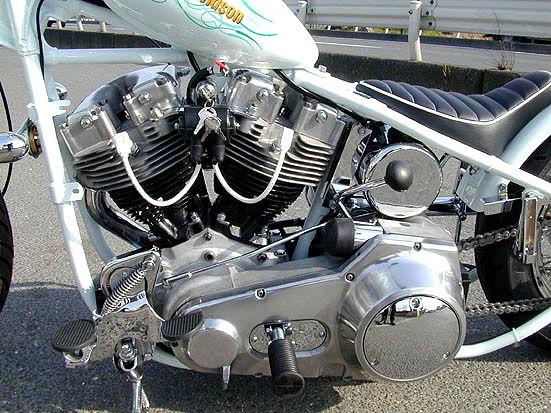 | SUキャブに抜けの良いドラッグパイプでもショベルなら問題ありません。もちろん騒音取り締まり対策のためにもバッフルの装着は大切です。音量に関しては巷のディーラー系ツインカムカスタムの方がもっとうるさいので良しとしましょう。 ステップ位置はミッドコントロールでキックアームも折り畳み式を採用。実際に乗ってみないとこの取り合わせの本当の良さは理解できません。 イメージカラーのホワイト以外のメタルパーツはクロム加工を施してゴージャスさをアップ。 |