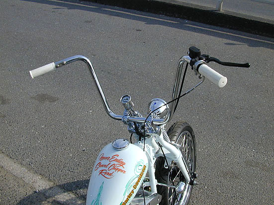 | 2.2ガロンのスモール・マスタングタンクにペイントショップ「ガンファーター」の繊細な透明感のあるホワイトをペイント。それをベースに大阪は堺市のショップ「ゴージ・ピープル」の華麗なるピンストライプでフィニッシュ。さらにタンクキャップには、ガソリン盗難対策のキーロック付きで抜かりありません。 | 余白 | 3インチ・ライザーとミディアム・エイプバーの組み合せで乗車姿勢は無理のないポジションに。ハンドルまわりはクラッチレバーがないのでグリメカのブレーキマスターと小型のスイッチキットだけになり軽快なイメージになりました。ちょこんと見えるミニメーターが走行中のオーナーに法定速度を知らせてくれることでしょう。 |