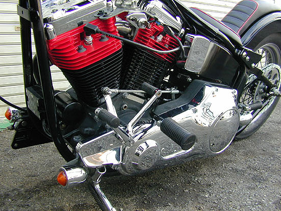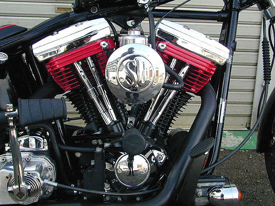 | エボモーターは、お決まりのブラックとレッドのツートンカラーにペイントして雰囲気を演出。エンジンの中心に取り付けられたハイマウントステップはかなりチープな造りになっています。SUキャブとキックキットは元々このバイクに付いていたもので、外装関係以外は肩の力を抜いたというか、あまり深く考えていません。 | 余白 | プライマリー側も横に大きく飛び出たハイマウントステップが目立つぐらいで得にイジってはいません。シフトペダルはノーマルのままでステップの位置に合わせて取り付け角度を変えています。シフトは踵で蹴り飛ばすようにして操作するんです。ちらりと見えるオイルタンクは高級感を廃してブラックにペイント。 |