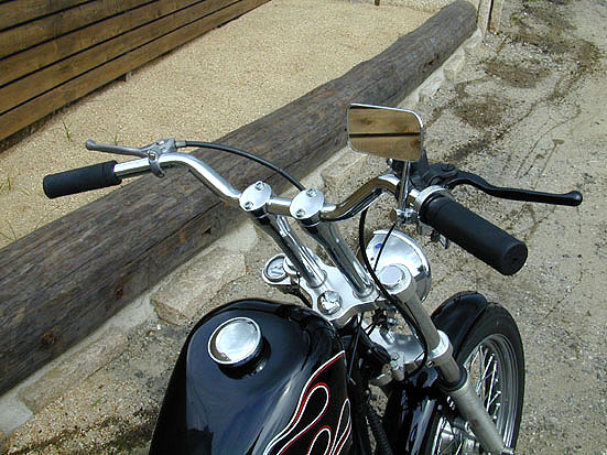| いつものとうり、ノーマルスポーツスタータンクを無加工で取り付けました。納車時にはブラックの単色だったんですが撮影のためバイクを持って来てもらうと、オーナーの意向でシンプルなフレイムパターンのピンストライプが施されていたのです。このチョッパーには良く似合っていて雰囲気出てますよね。 | 余白 | GMA製のナロートリプルツリーに8インチライザーとスーパーバーのセオリーから外れないスタイル。もちろん、軽快感を演出するために野暮ったいノーマルスイッチボックスはオミットして、走行に必要最小限のモノだけにしています。ブレーキマスターはシックスモーターサイクルでは最近よく使うグリメカ製。 |