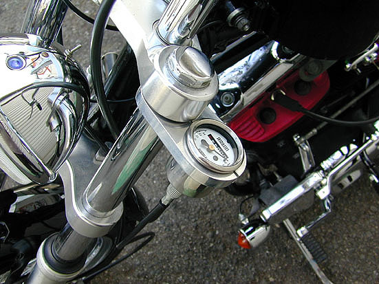 | シックスモーターサイクルチョッパーでは奇跡的に珍しくメーターを付けています。メタリックに輝くアルミ地のトリプルツリーに合わせて最近、当店と仲が良いと一部でウワサのフェイク様のメータークランプを使用させていただきました。 | 余白 | 中央からカットしてナロー加工されたフェンダーとセットになった迫力のあるステッチと後部が扁平なスタイルが魅力のワンオフガンファイターシート。赤いパイピングが特徴的なこのタイプのシートも当店ではめったにお目にかかれない一品です。 |