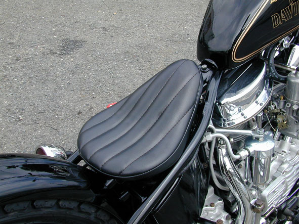| 旧車ゆえミッションはメカニカルトップ・システムなので、それに合わせたジョッキーシフト。シフトノブはダイススタイルのお宝パーツであります。サイドマウントされたフォードタイプのストップライトはもう定番ですね。ナンバーボルトはヴィンテージのジュエルマーカーを装着。 | 余白 | タテステッチの入ったソロシートは当店ではおなじみのONE・OFF。 このタイプのシートはフォルムがシンプルゆえステッチのデザインによってレーシーにもラジカルにも変化できる応用範囲の広いものです。このステッチはなんとなくスポーティなイメージが感じられます。 |