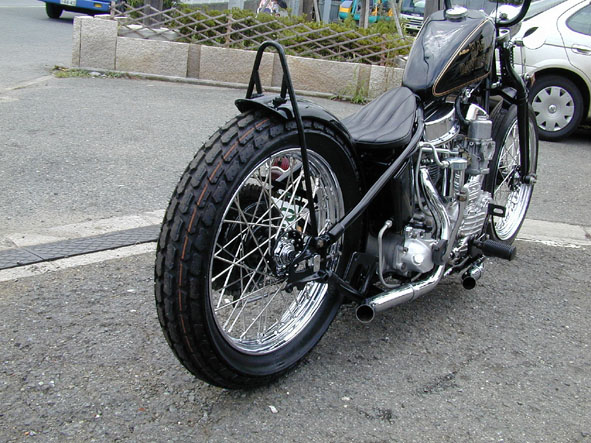 | フロントは19インチでタイヤはオーソドックスにAVON・SP-MK2をチョイス。ライトはスポットランプを加工、普通の4.5インチライトとは違い横から見た時の綺麗なアールが特徴的です。原始的なシステムですが、在ると無いとでは大きな差がでるダンパーも装備。 | 余白 | リアタイヤはブロックパターンのDUNLOPのK-180を履かせ、それに合わせてリブ付きのリアフェンダーを加工。シッシバーも丸棒を曲げてアールを多用したスタイルにしています。リアスタイルだけ見ますとオートレースのマシンに近いバランスなっていますね。 |