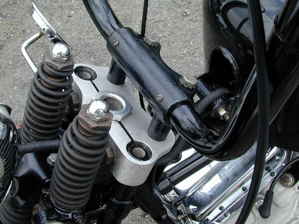 | 極端に幅が狭くもなければ広すぎもしないように幅を詰め、さらにグリップの角度をワイドに加工したエイプバーハンドル。スイッチ類はいっさい取り付けていません。しかし、利便性を優先してアクセルシステムはケーブル外出しのものに。グリップはあまり見かけないブラックカラーのシカゴ製をオーナーの好みでチョイス。 | 余白 | 今回のキモ!シックスモーターサイクル入魂の逸品。ステンレスを鋳造して製作したスプリンガー・トップブリッジであります。ライザー穴をノーマル幅に設定していますので大概のライザーポストなら取り付け可能の優れモノ。これでハンドル選択の幅がぐっと増えました。今回はショベル純正のライザーを流用。近日中に当店にて発売予定。みんな買うべし! |