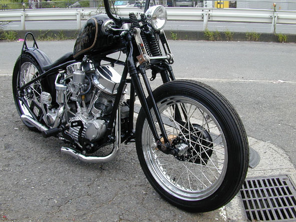 | 「パンヘッド・チョッパー」シックスモーターサイクルでは、久しぶりに手掛けるモーターです。このウェブページでも開設以来初めて紹介することになりますね。以前は当店でも私が所有していたのを含めて何台かあったのですが、いつの間にか姿を消してしまいました。 今回のオーナーはパンヘッドばかり乗り継いでいるパンヘッド・マニアであります。ベース車両もオーナー自ら持ち込んだボバ−タイプでしたが、2台目ということもあり奇をてらわないオーソドックスなスタイルへとなりました。しかし、ベースとなった車両のフレームのスタイルやミッションケースの状態などが良くなかったのでほとんどのパーツが廃棄処分となり、製作期間も2年と長期に渡ることになったのです。そのためにオーナーの好みも変化していき、製作が始まった時はリア18インチが印象的なこのスタイルで始めたのですが、いま現在すでにオーナーの頭の中には次なる構成も決まっているようで、ゆっくりと変化していく予定です。スタンダードなスタイルと一口に言っても時流によって細かな仕様の違いが生まれるので、こだわる人にはそのズレが気になるのです。誤解を恐れずに言えば、ハーレーも旧車となるとそのこだわりが表現できないとチョッパーだとしても、意外とつまらないモノになってしまうように思えます。もちろん最終判断は予算を握るオーナーが下すので、旧車に乗ろうとする人は一癖あるこだわりがなくてはいけません。 |