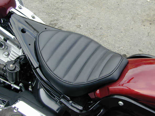 | タンクはノーマルの大きなモノからスポーツスター・タンクに変更。ガソリンタンクはバイクのスタイルに大きく関わってくるので、タンク交換はがらりとイメージを変えるには強い効果があるのですが、それだけにタンクのチョイス、取り付け位置を間違うとかなり「痛い」モノに成り下がるので気を使います。カラーは虚飾を排してダークレッドのキャンディ・ペイント一色でまとめました。 | 余白 | キャブレターはノーマルのままで、エアクリーナーのみメッシュのラウンドタイプに交換。シリンダーヘッドは点検整備のついでにサンドブラストでナシ地仕上げ、その下のシリンダーはブラックペイントでメリハリを演出しています。排気系はオーソドックスなテーパード・マフラーを選び全体の雰囲気に合わせてマット・ブラックでペイントしました。オイルタンクもブラック仕上げでクローム部分とのバランスを考えています。 |