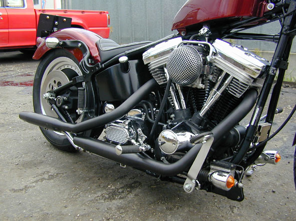 | 「やりすぎない、スマートなソフテイル」をコンセプトにタンク位置も上げ過ぎず、ハンドルも高過ぎず、フェンダーサポートも切らずにシックスモーターサイクルが仕上げた「チョッパー」です。デザイン的には特に目立ったトコロもないのでV誌の読者には見向きもされないかも知れませんが、良い大人がさらりと乗れるチョッパーとしてはスマートでカッコイイフォルムではないかと自負しております。 当初、フロント周りはワイドグライドにて製作していましたが、オーナーの好みでナローフォークに変更。ボトムケース・オイルタンク・リアホイールそしてマフラーはブラックペイントにてイメージを引き締め外装は渋いキャンディカラーで仕上げました。最近は結構、ラフな造りのカスタムを見かけることが多いのですが、今回のチョッパーはスタイル的にはやや大人しめではありますが、三流とはゆえ当社もプロショップなので細部の造作の丁寧さや仕上げの良さは折り紙付きで、きっちりと造り込んでいます。カスタム屋たるもの、そういう基本的なトコロを大事にしていきたいものですね。それでいて、「おおっ!これぞシックスモーターサイクル・スタイル!」というモノが出来れば最高なんですけどね。 |