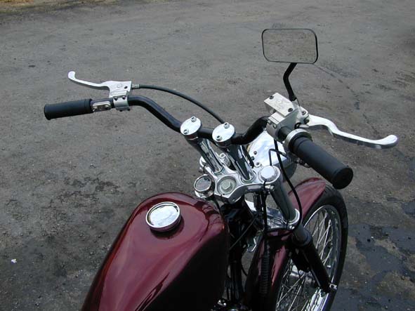 | クロームの6インチ・ライザーに親交の深い長野県のカスタムショップ「LOWS MAGIC MACHINE」のブラック・オリジナル・スーパーバーのセットアップ。それに合わせる小型のスイッチ関係は「Fake」であっさりと仕上げました。 | 余白 | 自称「ワルぶっている」チョッパーショップなのに最近なぜかよく使われるミニメーターにはスイッチと同じく「Fake」製メーター・クランプで固定されます。クールなカスタムを数多く手掛けるショップだけにデザイン的にも洗練されていますね。 |