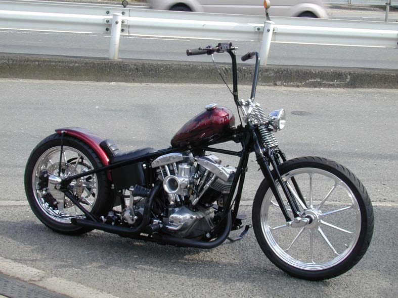 | オーナーが代替わりしたのにしたがってポジションを変更しました。前のオーナーはK-1のチェ・ホンマンのごとき大男でしたが、新しいオーナーはごく普通の平均身長の体格ですので特大だったハンドルバーを普通のエイプバーハンドルにカット。これで、ライディングポジションはずいぶんと楽になったはずです。 キャブレターはオーナーの好みでS&S-Eから、マイルドなレスポンスが特徴のSUキャブに。その他は操作系を含め変更はありません。 |
