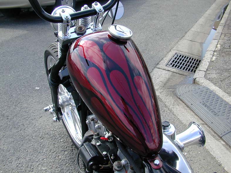 | プレーンなカラーリングから、ベースはそのまま手を加えず、薄いフレイムパターンを被せました。もともとシンプルなスタイルの完成度の高いチョッパーでしたので、余計な手を加えるとマイナス・イメージになりかねませんのでこのレベルのリメイクで止めておくのが良いでしょう。 |
