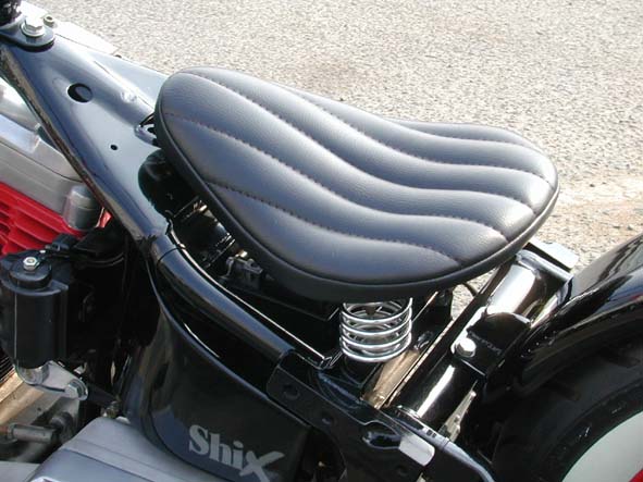 | ソロシートは毎度お馴染みのイージーライダース社製の縦ステッチの入ったモノ。これにショックとポジション対策のスプリングを合わせています。 | 余白 | 5インチフラットフェンダーにシンプルなONE・OFFシッシバー。共にブラックペイントされ、コンチネンタル氏のピンストが効果的に入っています。 |