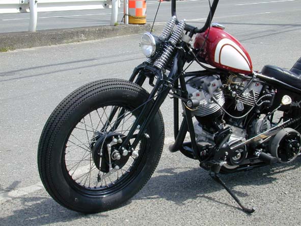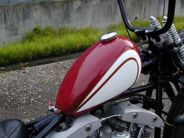 | さっぱり売れない当店発案の万能スプリンガー用・トップブリッジに2ピースハンドル用純正FLライザーをセット。それにブラックペイントされた程良い高さのエイプバー・ハンドルの組み合わせ。スモール・スイッチキットがすっきりとまとまっています。 | 余白 | ピーナッツ・タンクは渡米したオーナーの心に焼き付いた一台ことWCCのパン・チョッパーのペイントを参考にアレンジを施して表現。ゴールドのフチドリは毎度お馴染みペインター「コンチ」の手によるもの。旧き良き時代をモチーフにしたデザインです。 |