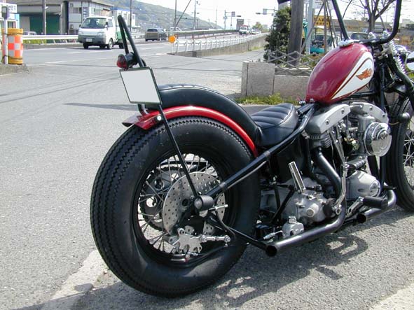 | オーナーは本場のチョッパーを直接体感したいがため単身渡米、WCCにてキラ星のごときチョッパーを目の当たりにした行動力のある人物であります。しかし何故か、WCCで有名なハイテック・チョッパーではなくマイナー気味のオールド・スクール・チョッパーに強く感化されてきたところが、シックス・モーターサイクルのお客ならではと言った感じではあります。今回は特に彼が強く惹かれたというパンヘッド・チョッパーをリスペクトしましてペイントを特別に再現してみました。 ショベルエンジンは造型など雰囲気がパンやナックルの旧車に近く、また旧車に比べて金銭的にも安価に抑えることができるので「ショベリジ」のネーミングでも有名でたいへん人気があります。もっとも最近はホットロッドイメージの4速スイングアーム車ベースのカスタムに押され気味ではありますが、リジッドフレームのシンプルさは、やはりカッコイイものです。 ベース車両は以前私が所有していたストリップ・スタイルのFLHなので、オーナーの理想とするオールド・スクール・チョッパーにするべくリジッド化や74スプリンガー装着など大幅にカスタムされました。方向性としては荒々しいワイルドなイメージではなく、ノスタルジックだけれど創りはキレイなカリフォルニア・スタイルをベースにしつつもシックス・モーターサイクルらしさを表現しています。 例えば、小さなパーツも丁寧な造作で仕上げ、アメリカ流のクローム表現も控えめに、布巻き配線もラフなイメージにならぬように神経を使い、細かな作業の集大成で全体の構成を練っていきます。 パーツの造作も数も大幅にカットされて無駄がなくなり、ショベル・チョッパーの面白味を全面に出します。コンセプトの過程が感じとれるように仕上げることでチョッパーの見え方が全く違うようになる。だから、このチョッパーはよくあるスタイルのはずなのに、こっちのほうが断然面白いと感じさせることが出来る。そう思えるようにシックス・モーターサイクル流に努めました。 |