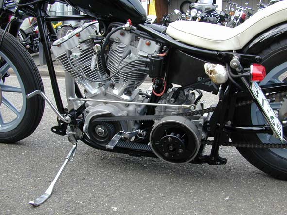 余白 | 1.5インチ・オープンベルトとノン・ロッカークラッチのジャッキーシフト仕様。ここで荒々しいオープンチェーンを選ぶとぐっとオトコの格が上がるのですが、もろもろの事情によりそこまではやっておりません。 デカい顔で天を仰いであります髑髏は、どこぞの土産物らしくオーナーの持ち込みでありましたが、厚みの薄い中空の鋳造品ゆえネジ切り加工に大変苦労しました。 基礎部分にFX系のステップパーツを流用したシンプルなワンオフ・ミッドステップは当店の得意技であります。 |