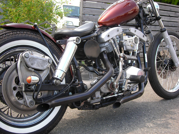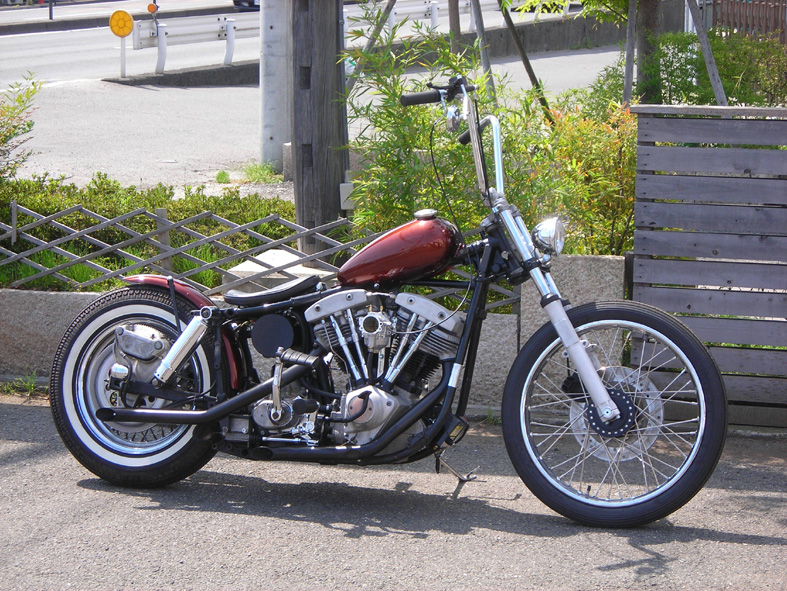 | オーナーの持ち込み依頼で製作しました件の4速フレームショベル・チョッパーになります。今回はオーナーの意向で低予算でのカスタムプランとなりましたが(当店では、ほとんど全てそうです。)今回特に元がFLベースということもあり、基本的なロー&ナロー・スタイルをカタチ創るために限られた金額のほとんどを注ぎ込み、細かなパーツなどはベース車両から流用、もしくは当店の在庫パーツを使用するという手法を取りました。 ところでオーナーはツインカムからの転び組であるのですが、ショベルをカスタムするとなるとオーナーの思い描くカスタムプランは彼に限らず、皆さんおおむね旧車の雰囲気をイメージされます。確かにショベルエンジンは基本設計がスポ−ツを含め50年代と古く、円形のシリンダーや掘削機のアンカーのようなロッカーカバーなどの造型が旧車の近い雰囲気がありますが、その他の車体構成部品は時流に乗り、後年式になるにつれてだんだんと近代的なデザインに変化しています。 マニアックな私的には、この年式のデザインもなかなか味わい深いものがあると思えるのですが、ストレートなイメージ重視の若いチョッパー乗りには、ダサいガラクタとしかみなされずに躊躇なく廃棄される悲しい運命です。そのような訳で当店の倉庫にはその手のパーツばかりが溜まり、よく雑誌で一流ショップの製作記事で使われるカッコ良い言い回し「倉庫の隅で転がっていたパーツを使っただけ。」と表現されるが、そんなパーツは常に「いにしえのお宝パーツ」である、などといった芸当は皆無で、まったくもって甲斐性無しのシックス・モーターサイクルの倉庫では正真正銘のジャンクパーツしか提供できない情けない台所事情であります。 今回特にベース車両が年式的にショベル末期の個体なので、オーナーの思い描くカスタムイメージに流用できるパーツが少なく、豊潤な予算で思うがままにパーツを取っ替えられたり、ワンオフ出来るならばともかく、とても限られた予算で平均以上の仕上げとなりますと、ここはひとつ「妥協とパッチモン(大阪弁で偽物のことです。)を上手く使う。」という荒技でいかせて頂きました。 例えば、ワイドグライドなフロント廻りをナローフォルムに変化させるべく使うは、以前カスタムついでに捨てて行ったEVOブレ−キが使える不人気・後期型35@フォークをサンブラ処理でオールドレーサー風にとか、ファットなリア廻りをナローフォルムに変化させるべく使うは、YAHOO!オークションでも落札されないEVOスポのフロントフェンダーを流用して、いにしえのサイクル・フェンダーのようになど、涙ぐましく、そして在庫処理を兼ねたアプローチでサクサクっと、このチョッパーを完成させました。そのような憐憫のこもった視点で改めてこのチョッパーを観察してみると、また考え方が違ってはきませんか。お願いします。 |