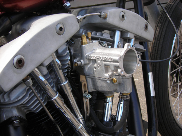 | パウコ製のグース・パイプマフラーは前後のバランスを整えるためにショートカット加工。バレルタイプのオイルタンクはバイト君の練習品。バッテリーは小型のものに変更してエンジン前に移設。リアキャリパーはノーマルの通称ブタ鼻ブレーキをそのまま流用。 | 余白 | 唯一、マニアを唸らせるパーツ、S&S社のスーパーBキャブをチョイス。セッティングがシビアなキャブで、SUキャブとは違って荒っぽいイメージがあり、これを選べるか否かではカスタムの雰囲気がまったく変化するバンカラなキャブです。 |