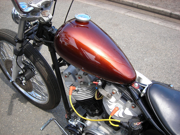 | ER製エイプバー・ハンドルに、FX系のノーマルライザーと当店定番のグリメカキットの組み合わせ。スイッチ類はエンジン横に設定しましたので、ハンドル廻りはすっきりと仕上がっています。 | 余白 | 加工無しの2.2ガロン・マスタングタンク。もとのデザインが秀逸なタンクですので単色のキャンディ・ルートピア・カラーで仕上げ、フォルムの良さを引き立てさせます。 |