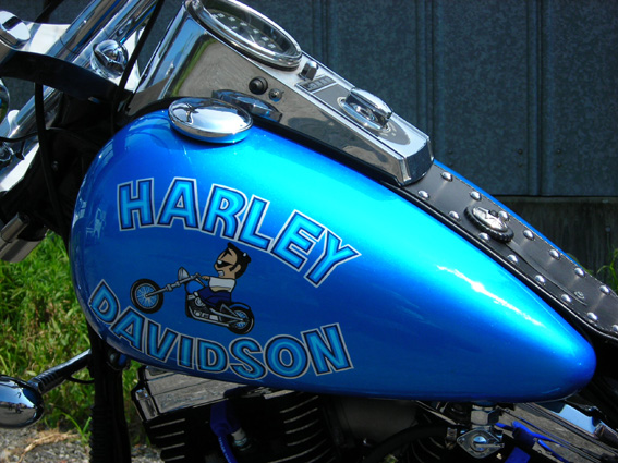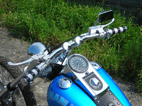 | ハンドル廻りは、お約束の質感の高いビレットとクロームの組み合わせ。こだわりの6インチ・ライザーと共にマルボロマン・カスタムのキモとなるポイントです。オリジナルは実のトコロ、もっとあっさりとした仕様なのですがイメージが強調されているのか日本ではビレットパーツが多用されます。ブレーキレバー関係はPMでゴムスリットの入ったグリップはキジマ製。当時はグリップ交換というと皆アルミだったぐらいです。ミラーも冗談のようなアレではなくて実用的なものをセレクトしています。 | 余白 | 洗練されたビレット&クロームとワイルドなスチール素材との融合があのスタイルの斬新さでしたが、あくまでも映画のガジェットとしての仕様で特に雨の多い日本の気候には合いません。ましてラットなど珍しくもない現在キレイに仕上げます。ベースカラーの鮮やかなメタリックブルーに例のロゴをアレンジして、オーナーのオーダーで何故かパチスロ吉宗キャラクターを配置。オリジナルの荒々しさを押さえ遊び心溢れるポップな雰囲気に仕上げました。 |