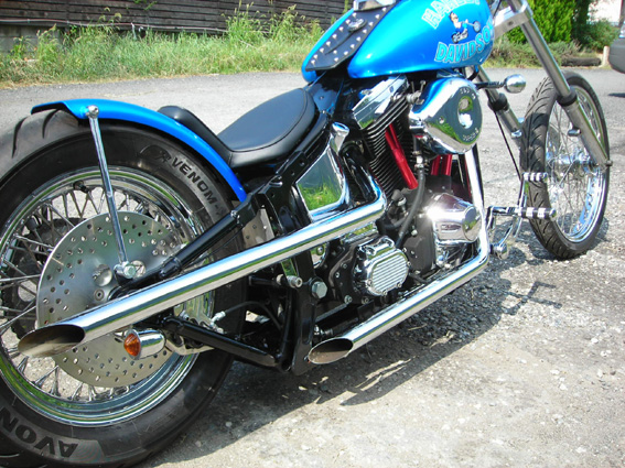 | 私をおおいに失望させたあの珍妙なドラッグ・パイプは再現せずにクロームメッキのショットガン・パイプに。専門誌でも記事にありましたが何故あのようなマフラー造作だったのでしょうか?ロークのオリジナルもそうなの?撮影中のアクシデントによる急造品かとも考えましたが、オリジナルのカスタムを手掛けたバーテルズが所有する撮影用クローンバイクも同様のマフラーなので、これは最初からフィルム写りだけを考慮してワイルドさを演出した造作だったのかも知れませんね。 キャブはS&S社のスーパーEをチョイス。もちろんエアクリーナーは映画のようには派手には揺れません。リアスポークはノーマルより少し多い60本用のリムとメッキハブを使用しています。 |