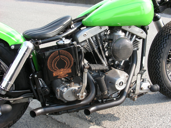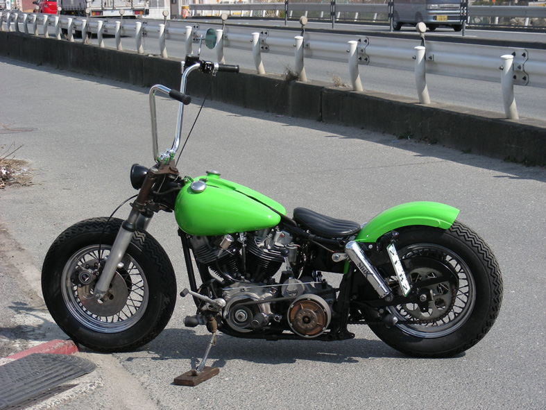 | ベース車両は以前このコーナーで紹介したバイクですが、オーナーの代替わりに合わせてリニューアルという運びになりました。21インチタイヤにファットボブ・フェンダーのスタイルから、スカイハイバーが印象的なチョッパーテイストを効かせたボバースタイルへと変化しています。 ノーマルをイメージさせる16インチタイヤとファットボブ・タンクのせいか大柄な雰囲気があるかもしれませんか、ボディラインからエンブレムをはじめとする装飾パーツなど出っ張り部分を極力廃し、細かな造作や雰囲気作りよりもマクロ的なロー&スリムを協調した構成となっています。 あえて流行りをスルーしたスカイハイバー・ハンドルも車体との高低差を視覚的に強く感じさせローフォルムを印象づける昔ながらのテクニックです。もちろん幅の狭いハンドルでも問題ないのですが、それでは当たり前すぎて面白くないでしょう。現在、王道とされるカッコ良さよりもアマノジャクなちょいハズし的カッコ良さのほうがシックスとしては好みです。むろん、ケースバイケースな面もありえますが。 ただしこの手のハズし技、基本的なところをしっかり理解していないと上手くハズすことが出来ません。直感だけ頼りに事を進めると本人はギリセーフだと考えていても大幅にハズした珍奇なだけのカスタムになってしまいがち。ハズすからには本道を理解する必要があります。その場だけの散在的な知識だけではダメです。きっちりと順序立てた歴史から学ぶこと。そうすれば、あやふやなイメージが点と点で結べるようになり最終的に線として理解できるようになれば、個人の付け焼き刃な発想よりも、100年に及ぶ先人達の英知を取り入れることの出来た、すばらしいカスタムがプランが出来ることでしょう。 自分の愛車がエヴォやツインカムだから関係ないと思っていてはいけませんよ。エヴォやツインカムだからこそ大事なのです。あなたの愛車が旧車の延長線上にあることを忘れてはいけません。現在はオールドイメージで成り立っているハーレーダビットソン・デザインなので極論すれば、ハズれ無しにはいじれません。何事も勉強、向上心です。我々はインスピレーションだけで勝負できる天才ではありませんからね。 話しが堅くなってしまいましたので、解説に戻りましょう。サス付きとなれば話題になるのがリア廻りの処理なんですが、スイングアーム車の場合ここの解釈が良ければその他の出来は関係ないと暴言を吐けるぐらい難しいものです。却ってリジッド車を手本に考えると出来の悪いモノにしかならないので、スイングアーム車の良さを活かしたアプローチで攻略すれば間違いないようです。そう考えればビックツイン及びスポーツスター共にショベルシリーズのデザインは実に参考になります。今回はその種類とはチト離れますが、結構面白いものが出来ました。 サイドマウント・ライトゆえフォルムがはっきりと解ると思いますが、長からず短すぎず薄すぎずの3拍子揃った会心の出来ではないでしょうか。当店としても、これをベースに色々楽しめそうです。 最後にカラーは旧車イメージのライトグリーン。通称アマガエル。塗装屋泣かせのツヤを微妙に抑えたノスタルジック・クリアー仕上げです。 |
