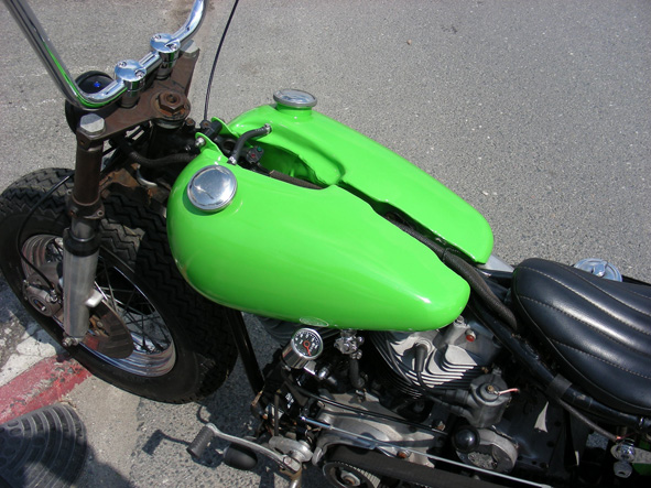 | 日本の誇るパーツメーカー・デイトナ製の2インチ・ラウンドライザーと、その存在を誇張するかのようなそびえ立つ、パウコ製スカイハイバー・ハンドル。どちらもボバースタイルでは敬遠されるパーツですが、シックスとしてはこのバイクはチョッパー・カテゴリーに分類していますので、もちろんクリア。また、あえて旧車好きなら最重視されるヤレた雰囲気を最初から意識的に出さないように製作しています。 | 余白 | 純正ローライダー3.5ガロンタンクはワイルドなスポーティさを表現すべくメーターダッシュを取り外し、必要最低限だけのパーツで構成します。シンプルなカラーと相まって半完成状態のようなタンクの雰囲気があります。現状ではタンク・ハンドル・シートに比べて錆だらけのフレーム・三つ又が違和感を与えますが、このチグハグさは月日を経ることによって緩和される予定です。ライトグリーン系は退色が早いので年月経過が楽しみ。 |