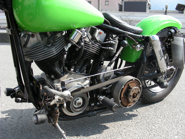 余白 | FX純正ペダルを流用したノンロッカークラッチ、オープンベルト・プライマリーの隙間から取り出されたステップはスチールベースを製作、ミッションにボルト止めしたものに、FXのマフラー側ステップパーツを組み合わせた造作。必要最小限のパーツ構成なので実にシンプルな仕上がりになります。 運転者からはタンクのせいで視認性がまったく良くないミニメーターの装着はオーナーの希望です。 |