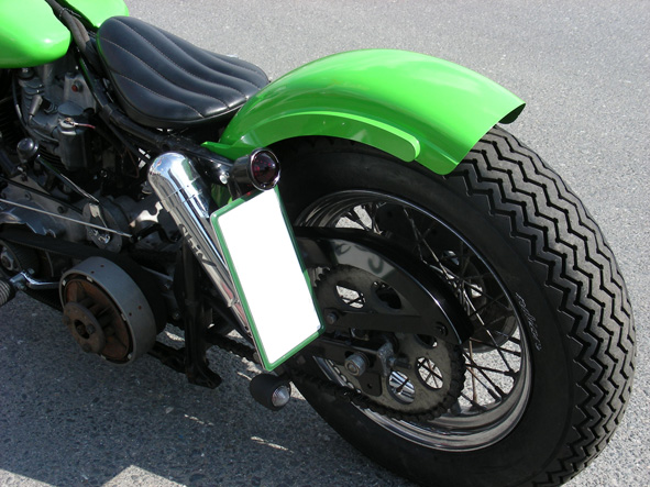 余白 | 映画の影響かカスタム・チョッパーのほとんどに取り入れられているんじゃないかと思われるサイドマウント・スタイル。リア廻りをすっきり見せるためと、そのやや違法性の悪のイメージが若者に受けるのでしょうが、彼等にはナンバーはともかくテールライトは邪魔ものとしか認識されないのでしょうか?好き嫌いはともかく、あまりに安易な発想が多いような気がしますが、これはこれでカッコ良いのもまた事実ですから困ります。 子供の描いたようなパターンのタイヤはインディアン・ビンテージというニューフェイスをチョイスしました。 |