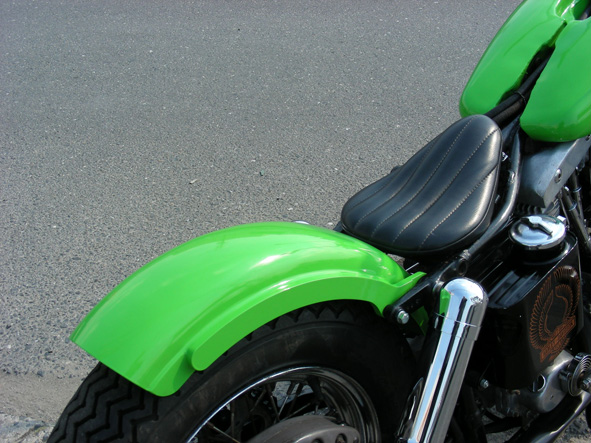 | 有るのか無いのかはっきりしないチビフェンダーはさておくとして、きっちりと造り込んだスイングアーム車のシンプルなフェンダーカスタムとしてはトップクラスにランキングされるのではないかと豪語するリア廻りの処理。 スチール板から切り出したフェンダー・ストラットが成功のカギですが、アイディアとしては20年ほど前の手法を参考にシックス流にまとめました。 今回は一体感を出すために社外のオールドスタイルのフェンダーをカットしたものにストラットを直接溶接してカラーも同色のライムグリーンにペイントしてあります。 |