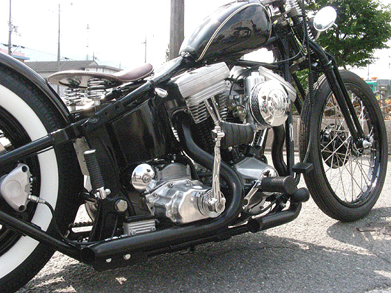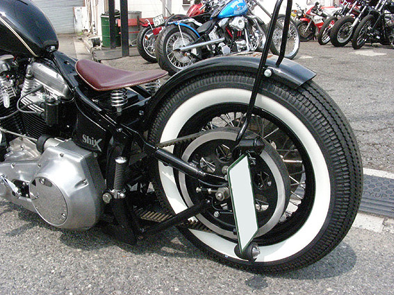 | ベース車両がFLSTなので元はグライド・フォークなのですが、ここは奮発して社外の74スプリンガー・フォークを奢ります。これが有るのと無いのではイメージが大きく変化するので値段も含め選択に悩むところですが、ベースが安価な低年式のEVOだったので、限られた予算の中でも十分クリアできるものでした。 | 余白 | クラシックなパターンのホワイトウォール・タイヤに合わせて、5インチ幅のフラットフェンダーの位置を決め、丸棒から造りあげたちょい長めのシッシーバーを合わせます。フレームとタイヤそしてフェンダーのきれいなラインが決まればリア廻りは完成です。後は好みでライト関係などをチョイスすれば良いだけですからね。 |