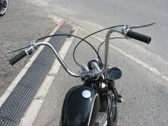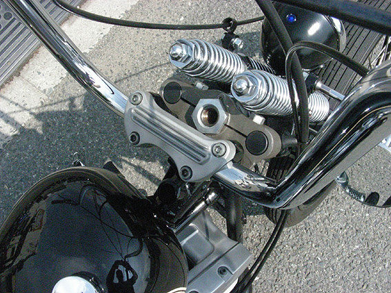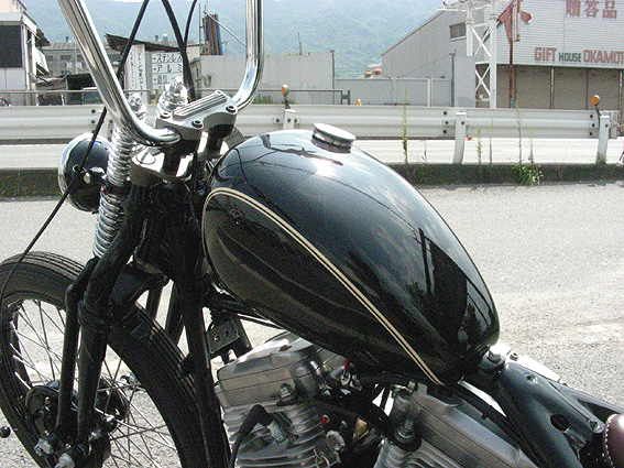 | ハンドルは軽く幅詰め加工を施したパウコ製ミディアム・エイプバー・ハンドル。オールドチョッパーを感じさせる程良い高さで、レバー類も先尖りのシンプルなものをチョイス。もちろんスイッチもオールドレプリカの小型タイプを使い、配線はパイプの中通しで見た目もスッキリと処理します。 | 余白 | スプリンガートップには当店が開発しました、テレスコ幅のライザーなら何でも装着可能な万能トップティーを使用。自信作ではありましたが、思ったほど反響がなく世間様とのギャップに苦しんでおります。ライザーはあえて、ノーマルショベルタイプを選び、渋いイメージを表現しています。 |