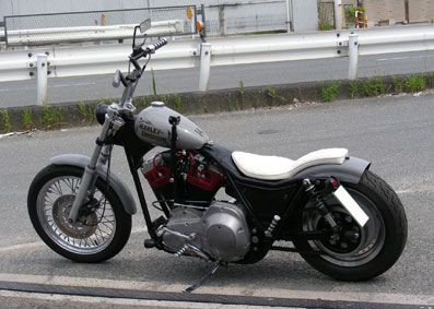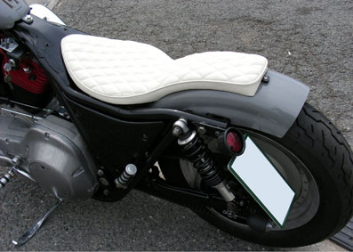 フレームに直接取り付けされたショートカット・フェンダーにワンオフのダイヤモンドステッチ・コブラシート。このような白いシートはすぐに劣化が表れてしまいますが、そのようなところが、いかにも使ってますよ感が出て良いのです。 |