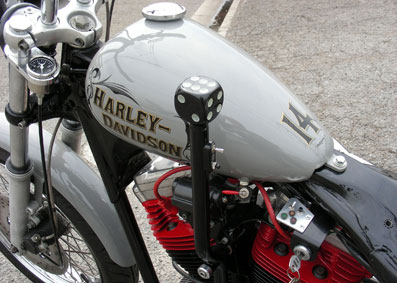 角パイプフレームに問答無用で取り付けられた2.4ガロンマスタングタンクは裏側をフレームに合わせて大幅に加工。 |