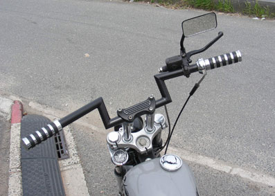トップのみ黒くペイントされた6インチライザーにまっ黒なZバーハンドル。ハンドル幅はFXRのナローツリーよりも、かなり広く両手でがっしりとグリップをホールド出来るようになっています。 |