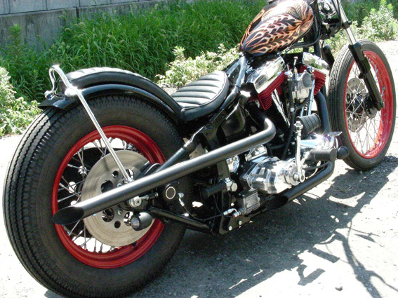 | 排気系はやや高い位置でストレートに取り回されたマットブラックカラーのショットガン・ドラッグマフラーをちょい加工して取り付け。過剰に造作に凝り過ぎたモノよりも普通っぽいデザインのマフラーのほうがノーマルフレームにはしっくり決まります。オーナーの憧れ、EVOにはいささかローパフォーマンス?ぎみな5速キックキットも装着されています。 | 余白 | 細身な5インチ・フラットフェンダーにぴったりと添ったデザインのコブラシートと飾り気を廃したシンプルなシッシバーによりリア周りのコンパクトさを実現。サイドマウントされたVLテールはこのスタイルでは定番です。ディープレッドのリムとクラシックパターンのタイヤチョイスによってほど良いクラシック感を表現しています。 |