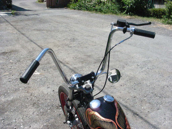 | ナローグライドで21インチホイールに交換されたフロント周りに、ノーマルライザーを利用して幅詰め加工を施したER製エイプハンガーを装着。流行りを避けたスタイルがある意味カッコ良い。 スイッチ類は移設され、なおかつジョッキーシフトなので、目に入るのはグリメカレバーとグリップのみというEVOカスタムではあまり見かけないすっきりとしたハンドル。また、ナローフォークなので4.5インチのベイツタイプ・ライトはセオリーに則っています。 |