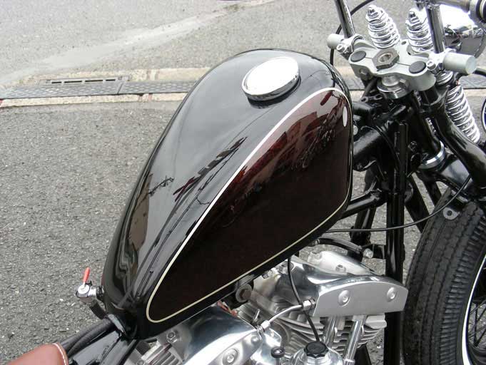 スポーツスタータンクは雰囲気のある純正レプリカフレームの鋳造的な構造を殺さないように取り付け位置を斜め前方にレイアウト。ちょっとした遊び心でハマータンクのようなイメージを表現するためにキャップ位置を片側に移動させました。写真では解りづらいですが、タンクペイントはブラックベースにブラウン系のマーブライザー処理を施したエレガントなイメージ。 |