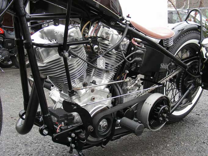 旧車のニュアンスを感じさせるためにワンオフされたタンクサイド・シフト。エンジンのセンターにシフトレバーを持ってくるとハイテック・チョッパーのイメージが出てしまうのを避けての選択です。ノンロッカー・フットクラッチとオープンベルトは軽装感のあるチョッパーイメージを演出するための王道ですね。しかし、旧車ならプライマリーカバーは薄いスチール製なので却ってそのまま残している方が雰囲気があったりしますけど。 |
