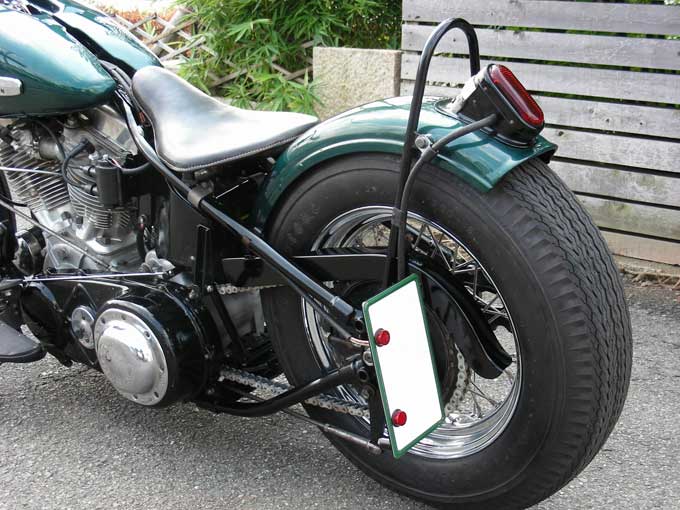 諸般の事情によりあまり深くは語れない15インチのワイドリムに思い切り引き伸ばしたタイヤをはめたリアスタイル。タイヤのアールにきれいに沿ったリアフェンダーには何故か当店に昔から在庫していた日本が誇るパチものハーレー陸王のリアランプを流用。配線はあえて横出しで見せる配線として処理して、シンプルなアール加工のシッシバーに這わせています。クローズドプライマリーはオープン仕様全盛の今では、かえってワルの雰囲気ですね。 |