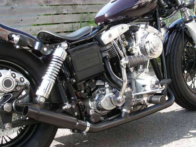 本来のロコボーイだと、スポーティーさを出すということでXRハンドルやドラッグバーなど幅の詰まったハンドルが多いのですが、女性オーナーだということも踏まえて力を加えやすい、幅広のハンドルをチョイス。ER製でその名も「デュオグライドバー」というちょっとテレがあるネーミングの製品です。スイッチ等はノーマルのスイッチボックスのマスター側だけを残し、そこに集中させるという懐かしい仕様。下手にスイッチを移設するよりラフな感じがしてイイと思いませんか。 |