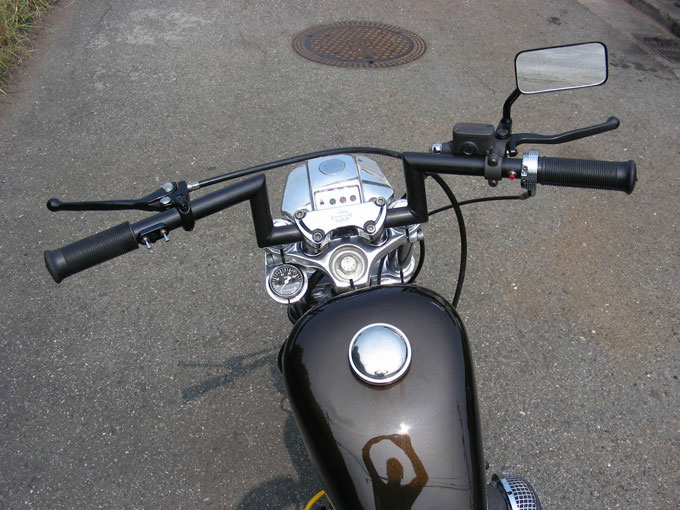 F19インチ、R16インチのホイールは丸ごとブラックパウダーコート。フロントフォークのアウターケースもホイールに併せてブラックペイントしました。同じくブラックのロボハンをノーマルライザーに合わせ、スイッチは小型化。ブレーキ関係はおなじみのグリメカマスターを使用。メーターは小型のモノに変更してトリプルツリー下から例のクランプでマウント。 |