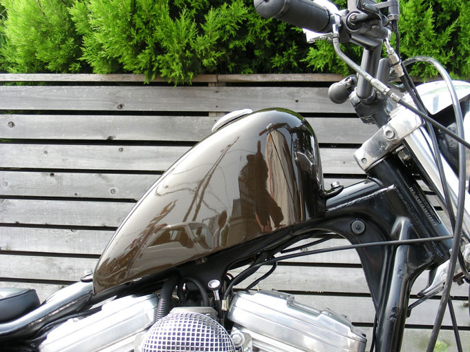 スポーツスタータンクはフレームの真ん中あたりにロートンネルマウント。ネック下のコイルはいつものようにV型エンジン中央に移設。ペイントはハウス・オブ・カラーのブラックパールというネーミングのやや赤みがかったメタリックブラックでオールペンしました。シンプルなカスタムには上質で落ち着いた渋めのカラーリングが良く似合います。 |