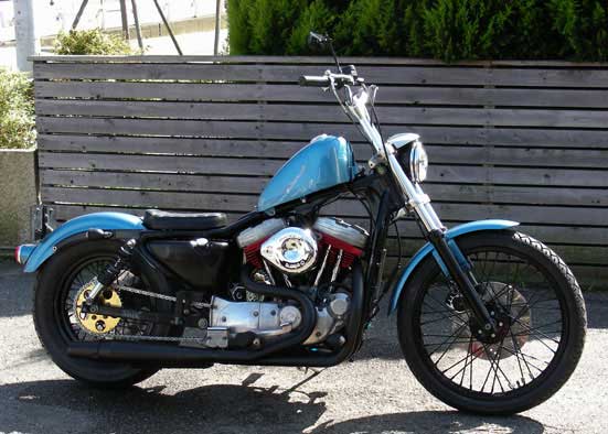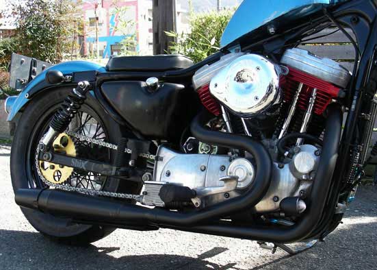 当時はスポーツスターにサンダーヘッダーマフラーが装着できるなんて新鮮でした。ビックツイン専用だと思っていましたから。もとはクロームでしたが、今回のイメチェンに合わせてブラックペイントされました。フィン先剥離無しの赤と黒のエンジンペイントもヘルズ仕様だといって、解っている店はよくこの仕様でした。当店では現在も懲りずにちょくちょくやっています。継続は力なりといったところでしょうか。 |