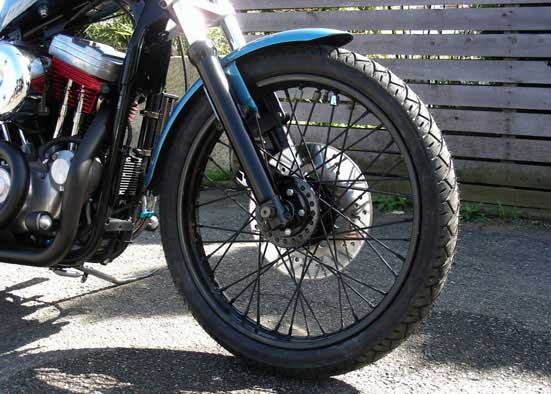 フロント廻りは19インチから21インチにインチアップさせ、チョッパーテイストを増しています。クラシックなイメージでハブもスポークもリムもまとめてパウダーコート処理でブラック一色に。合わせてフロントフォークのボトムケースもブラックにペイントしました。 |