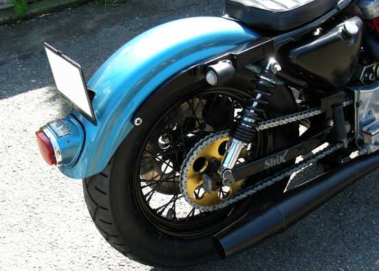 リア廻りもインチアップこそしていませんが、ペイントはフロントと同じ処理を施しています。リアフェンダーと共にタイヤに沿ってアールを描くフェンダー・ストラットは前期スポーツスターならではの美しい造形ですが、これも雰囲気に合わせてブラックペイントに。リアタイヤも、もちろんメッツラーME880で揃えています。 |