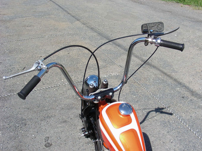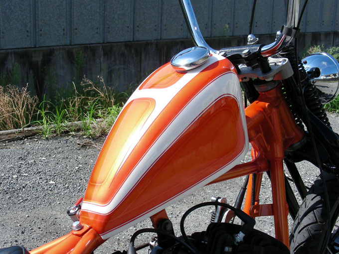 キャブレターは怪しげな社外品だったので、パワーアップの期待も少しはこめてM74リンカートをチョイス。装着にはマニホールドの穴加工が必要となります。電装系は言わずもがなの12Vに変更。プライマリーはチェーンでカバーもノーマルカバーとしています。この旧車独特のプライマリーカバーはセルが設定されていないのでそのための強度が必要とされず、本当のチェーンカバーの機能だけでしかなくチョッパーにそのまま付けてもダルさを感じさせることはありません。シフトペダルはロッカークラッチのベース部分を加工したもので、チト気の効いた造作となっています。